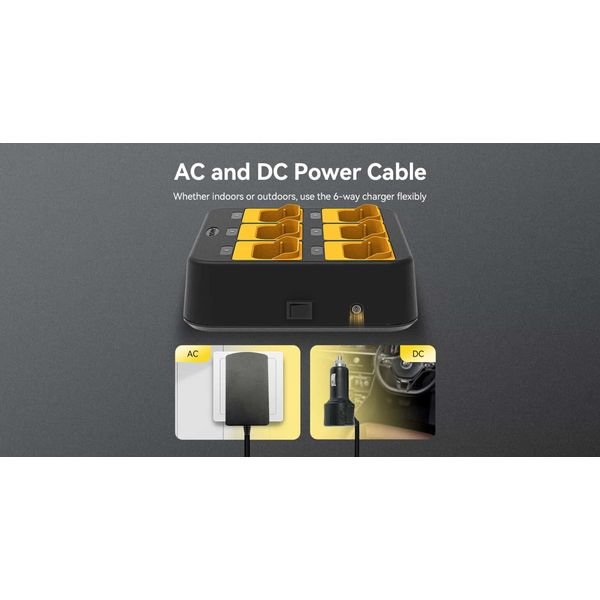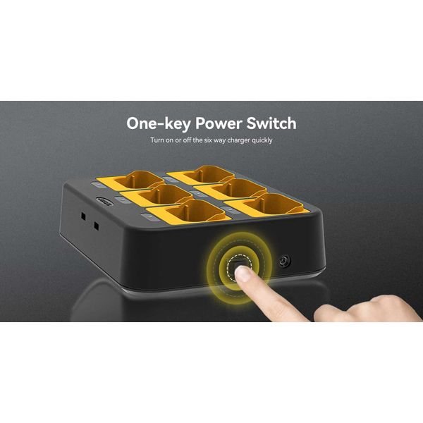Διακόπτης τροφοδοσίας με ένα πλήκτρο, μία φορά για να ενεργοποιήσετε ή να απενεργοποιήσετε ολόκληρο τον φορτιστή 6 κατευθύνσεων αντί να λειτουργείτε τον φορτιστή επανειλημμένα, αυξάνοντας την ευκολία των λειτουργιών κατά τη φόρτιση. Ενεργοποιήστε ή απενεργοποιήστε το φορτιστή 6 θέσεων πατώντας ένα πλήκτρο.