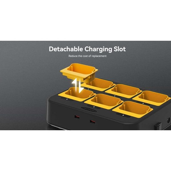 Αυτός ο φορτιστής έξι θέσεων είναι κατασκευασμένος από  ανθεκτικό υλικό ABS και PC, το οποίο έχει ισχυρή ικανότητα να αντιστέκεται σε χτυπήματα και κραδασμούς και υποστηρίζει αποτελεσματικά τη μακροχρόνια χρήση.